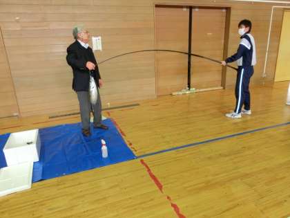 体験はカツオの1本釣りの疑似体験。鰹節の削り体験。出汁の試飲でした。カツオはとても重く皆苦戦していました。