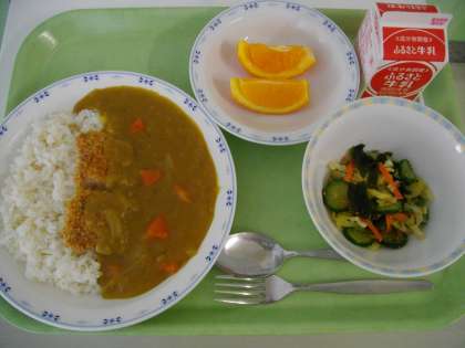 本日は受験生応援メニューで、カツ(勝つ)カレーライスといよかん(いー予感)を出しました。また、1年生でわかめに関する出前授業があったので、わかめサラダも出しました。