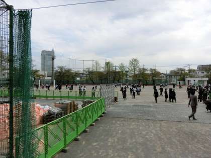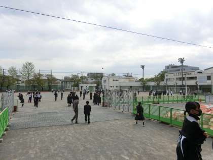 給食の後は昼休みです。耐震工事で少し狭い校庭で遊んでいます。工事の範囲に入ったボールは見守る先生が入りとっています。