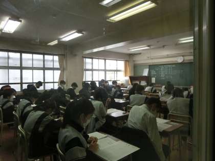 国語から始まり、数学、社会、理科、2・3年は英語のテストがありました。皆真剣に問題に取り組んでいます。
