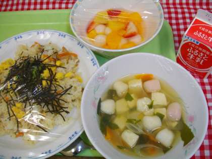 「ちらしずし、紅白すまし汁、フルーツ白玉、牛乳」です。