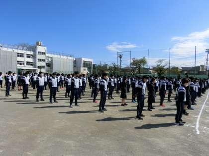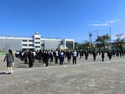 1時間目に避難訓練を行いました。本日は避難経路の確認を目的として行いました。その後、全校生徒が初めて対面したので、対面式も行いました。