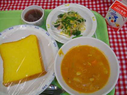 「豆乳フレンチトースト、ビーンズシチュー、ほうれん草のサラダ、ぶどうゼリー、牛乳」です。