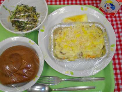 気温が上がってきています。外の体育は半袖が気持ち良さそうでした。今日は汁物がないので、牛乳を残さず飲んで水分補給をしてほしいと思います。