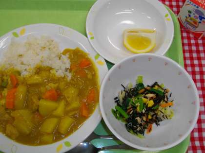 「カレーライス、ひじきとツナのサラダ、スイートスプリング、牛乳」です。