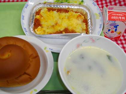 「黒砂糖パン、シェパーズパイ、グリーンサラダ、豆乳スープ、牛乳」です。