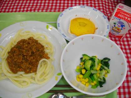 「肉みそうどん、小松菜のサラダ、パインクーヘン、牛乳」です。