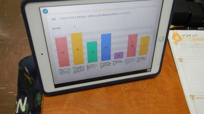 道徳の時間にタブレットを使用し、皆からアンケートを取りながら授業を進めました。