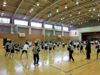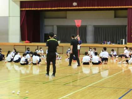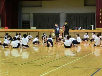 1年生は6時間目にスポーツ大会の練習で、玉入れの練習を体育館で行いました。