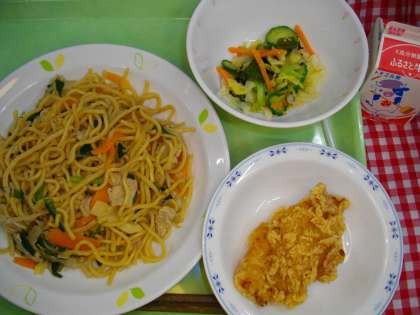 「塩焼きそば、わかめサラダ、とり天、牛乳」です。