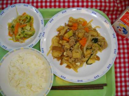 「ごはん、豚すき焼き、梅ドレサラダ、牛乳」です。