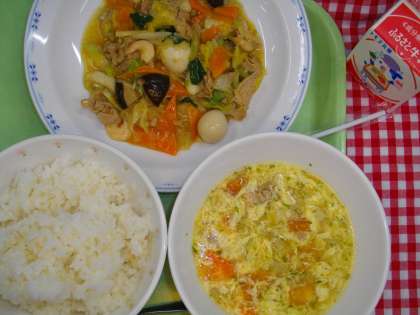 「麦ごはん、八宝菜、卵スープ、牛乳」です。
