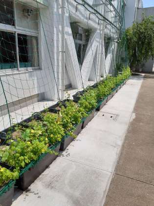用賀中学校では、正門を入って左手の校舎の窓に毎年ゴーヤで緑のカーテンを作っています。