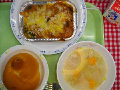 「ミルクパン、夏野菜のミートグラタン、コーンサラダ、スコッチブロス、牛乳」です。