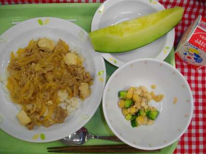 「豚丼、ビーンズサラダ、メロン、牛乳」です。
