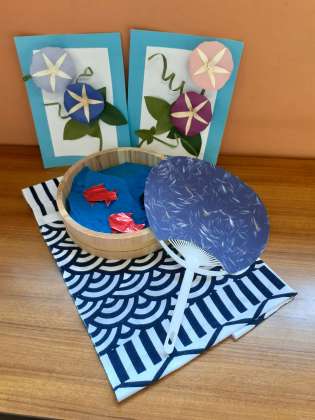 7月に入り、夏も近くなりました。飾りは一足早く夏です。フキンは60周年記念の時のものです。