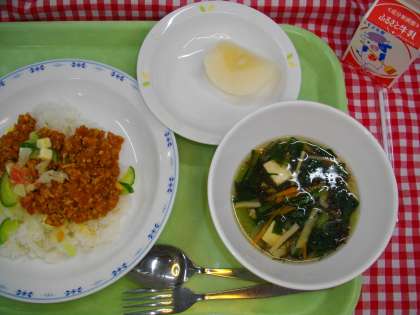 9月に入った途端に気温が上がらなくなり、夏を惜しむ献立も季節外れのように感じてしまいます。とは言え、子どもたちの熱気は冷めやらず、教室で食べるにはちょうど良いのかもしれません。今日はスパイスをほんのり効かせた「タコライス」と具だくさんの「もずくスープ」でした。