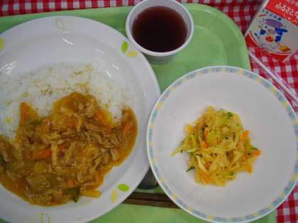 今日の副菜は、「切干大根」を野菜と一緒にさっと茹で、ごま酢で味付けをした和え物です。「切干大根」は、さっと水洗いしただけでシャキシャキとした食感が楽しめますし、和・洋・中の調味料とも相性が良いので、バリエーションを増やすことのできる食材です。給食では、煮物のほか、卵焼きに加えるメニューなどがあります。