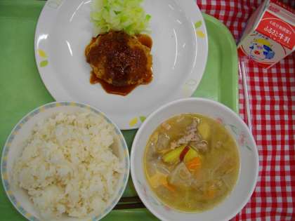「麦ごはん、ポテトコロッケ、ゆでキャベツ、さつま汁、牛乳」です。