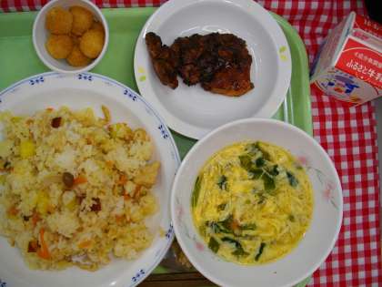 「秋の香りごはん、鶏肉の辛味噌焼き、かき玉汁、月見団子、牛乳」です。