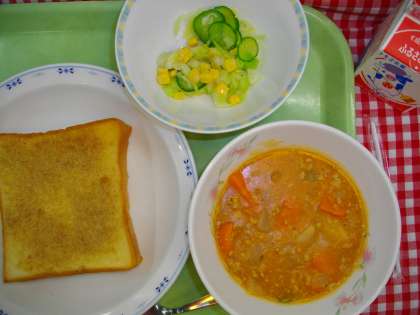 「セサミトースト、ハンガリアンシチュー、コーン入りフレンチサラダ、牛乳」です。