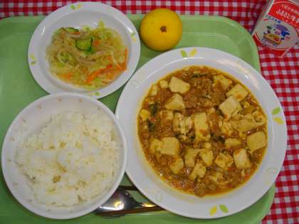 「ごはん、麻婆豆腐、春雨サラダ、みかん、牛乳」です。