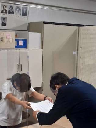 お昼休みに校長室で新しい生徒会役員と各委員会委員長の認証式を行いました。