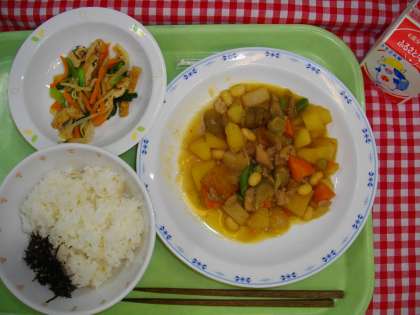 「麦ごはん、ひじきのふりかけ、豆入り筑前煮、おひたし、牛乳」です。