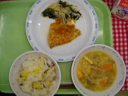 今日は、ボリュームのある献立でした。ごはんのさつま芋は、色よく柔らかく炊けました。唐揚げにして南蛮酢で味付けした鰺は、身がふっくらとしていました。お日様が出て爽やかな風が吹き、食べ物が美味しい秋の日にぴったりのメニューです。
