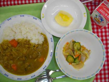 「きのこのカレーライス、こんにゃくサラダ、りんご、牛乳」です。