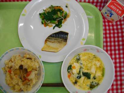 「吹き寄せごはん、鯖の塩焼き、野菜の辛子醤油かけ、かきたま汁、牛乳」です。