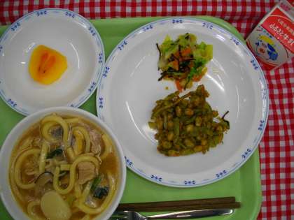 「京風たぬきうどん、大豆と葱の抹茶揚げ、野菜の塩昆布和え、柿、牛乳」です。