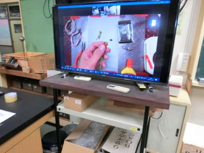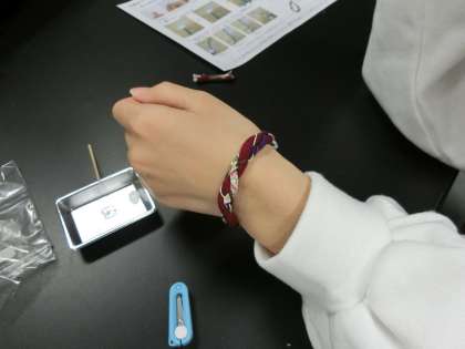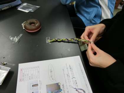 皆、真剣に糸やひもを組んでいます。4本なのできれいに編むのは結構難しいようです。