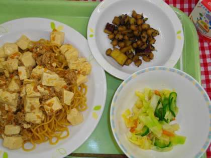 「麻婆豆腐焼きそば、中華サラダ、お豆かりんとう、牛乳」です。