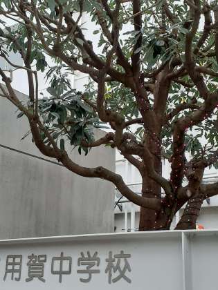 正門にあるゆずり葉の木にちょっとだけイルミネーションがしてあります。