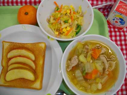 「アップルシナモントースト、イタリアンサラダ、白いんげん豆の田舎風スープ、みかん、牛乳」です。