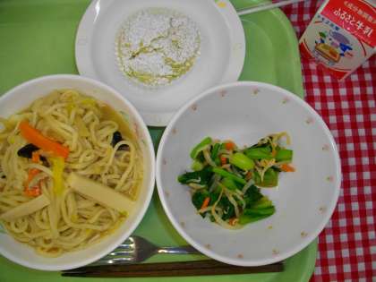 「ちゃんぽん麺、野菜の辛子醤油かけ、米粉明日葉ケーキ、牛乳」です。