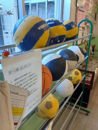 ボールは職員室前の廊下に、各学年ごとに貸し出ししている棚があります。