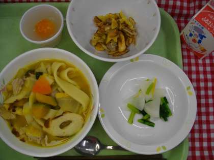「ほうとう、根菜チップ、蕪の柚子和え、金柑ゼリー、牛乳」です。