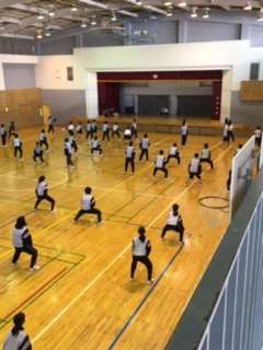いよいよ、1年生のダンスの授業が始まりました。講師の先生はやさしく教えてくださっています。