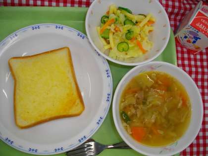 「ガーリックトースト、白いんげん豆の田舎風スープ、マカロニサラダ、牛乳」です。