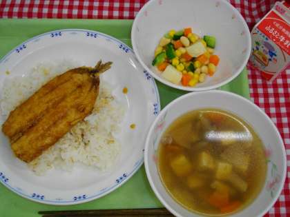 今日は節分メニューです。子どもたちにあまり人気のない鰯は、粉をつけて油で揚げ、たれをからませて蒲焼きにしました。大豆は、サイコロに切った野菜と一緒にサラダにしました。お箸で一粒ずつつまむと、お箸の練習にもなるメニューです。もりもり食べて、邪気を払いましょう!