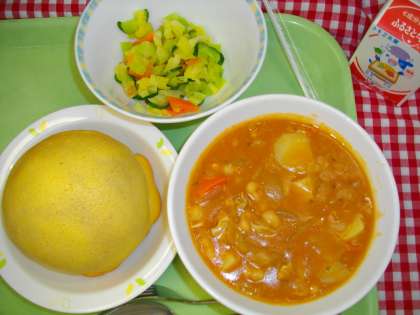「ビスキュイパン、ビーンズシチュー、パリパリサラダ、牛乳」です。