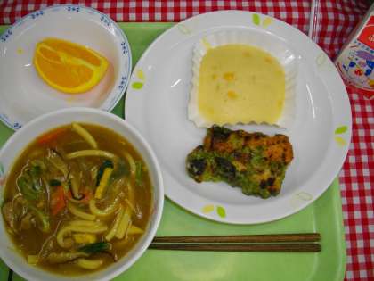 「カレー南蛮、竹輪の磯辺揚げ、コーン入り蒸しパン、ネーブル、牛乳」です。