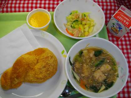「きな粉揚げパン、肉団子入り春雨スープ、ツナサラダ、フルーツゼリー、牛乳」です。