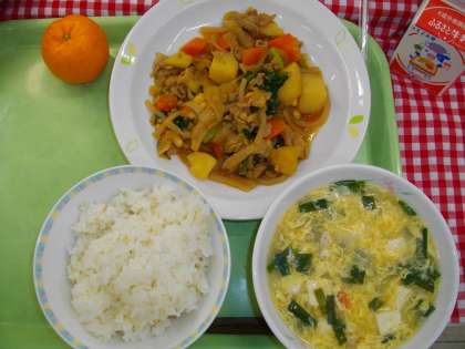 「麦ごはん、韓国風肉じゃが、にらたまスープ、ぽんかん、牛乳」です。