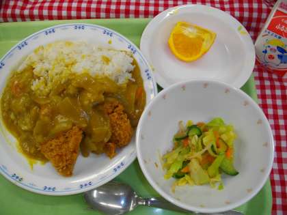 「勝つカレーライス、梅ドレサラダ、いよかん、牛乳」です。