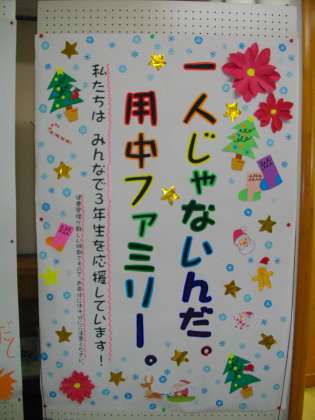 昇降口には3年生へのメッセージが表示されています。今日は用賀中恒例の応援メニューです。