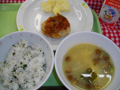 「わかめごはん、洋風ハンバーグ、粉ふき芋、なめこの味噌汁、牛乳」です。