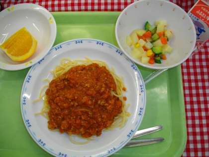 「スパゲティミートソース、マセドアンサラダ、八朔、牛乳」です。